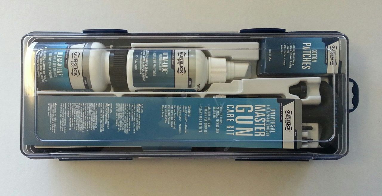 -4oz. Ultra-Lube -4oz. Ultra-Klenz -Blacked steel rod with “soft grip” handle -Muzzle guard -Phosphor brushes -Wool mops -Cotton patches and cleaning tips and jags. All this stores in a reusable storage box.