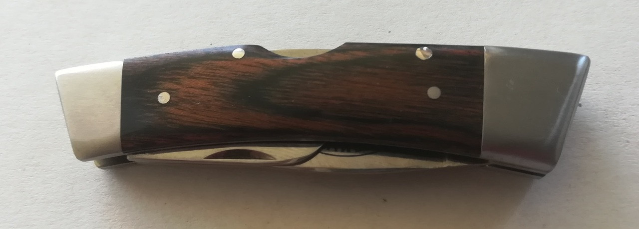 HANDLE:Made of multi-layers of geniune Teak and Ebony hardwoods, bonded together with super hard resins at very high pressure. This process produces a One-Of-A-Kind wood insert that is incredibly hard as it is beautiful skilled craftsmen hand shape the insert to perfectly fit the handle.