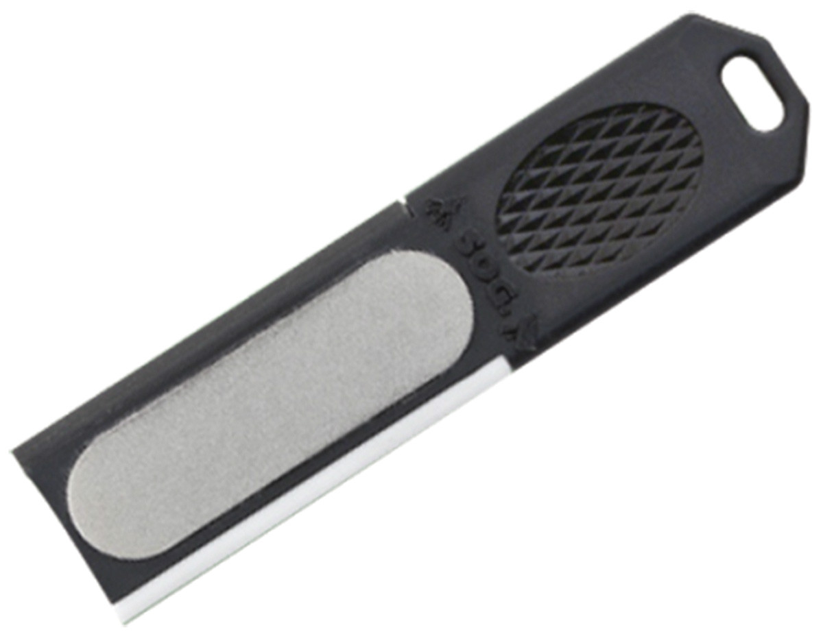 SOG sharpener is a great example of innovative design in a concise package. With a flat diamond sharpening pad, cylindrical ceramic sharpener (that can be use for serrations) as well as a fire starter (just in case), you have the makings of the perfect companion to any SOG knife or tool.