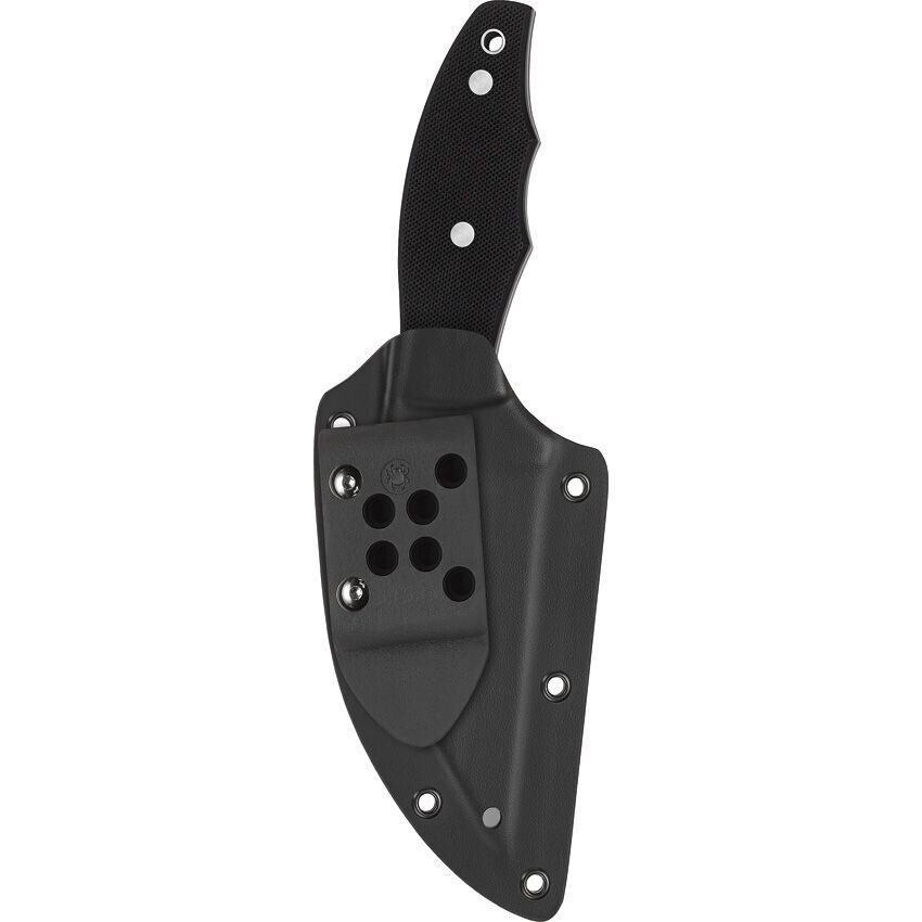 To ensure maximum strength and a deft balance, the Ronin 2 features a skeletonized full tang capped by thin textured black G-10 scales that guarantee a positive grip while allowing the knife to be easily carried and concealed. At the junction of the handle and blade, the tapered, ergonomic profile of the handle flares to create a very effective integral guard that protects the user’s hand from sliding forward onto the edge.